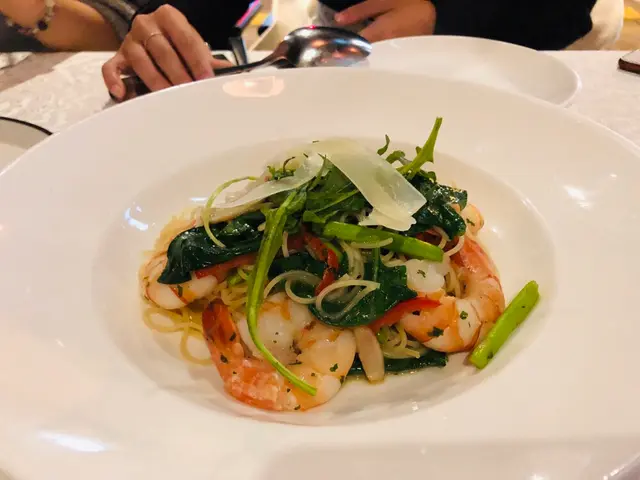 美國蘆筍鮮蝦菠菜天使麵,同海鮮拼盤嘅鮮蝦一樣十分大隻,平時喺外面都比較少食到天使麵,呢間餐廳煮得十分入味,份量亦都好足,十分滿足!