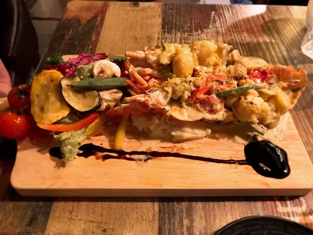 馬蘇里拉芝士焗原隻龍蝦薯菜, 龍蝦啖啖肉配上醬汁,加上配菜如mushroom,多種沙律菜等等,Yummy。