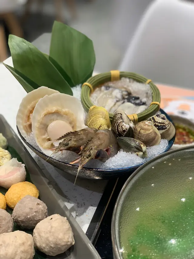 之後就換咗個煲打邊爐啦,我哋揀咗皮蛋芫荽做火鍋湯底,打邊爐嘅食物都好豐富,佢哋提供左海鮮拼盤,氣管入邊有鮮蝦、蜆、蠔、元貝、同埋脆肉鯇。佢哋嘅元配都好大隻,而且啲蝦都好彈牙。