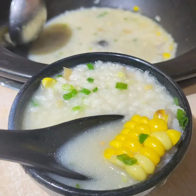 由粟米、芋頭 、排骨組成的粥底,粥煮得十分綿,原汁原味,不油膩 ,至少每人3碗
