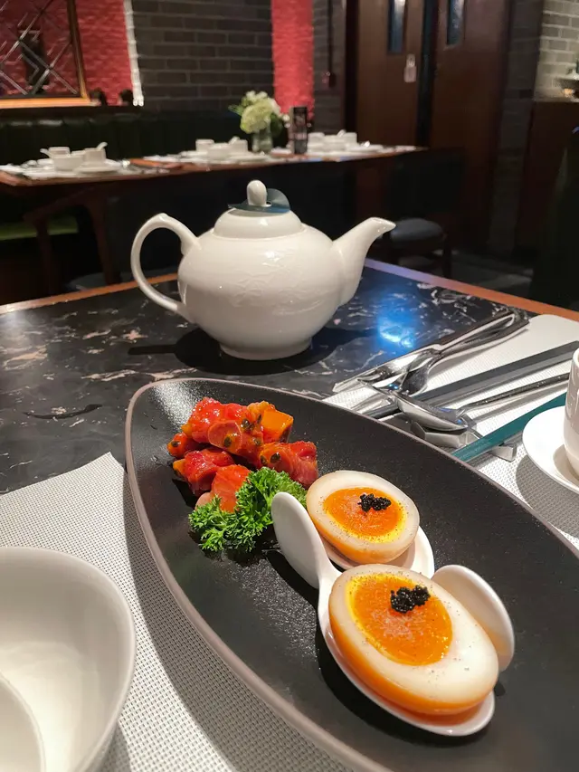 我們點的二人套餐,有七道菜,菜品豐富,色香味俱全。首先是本幫糖醋小排骨,外焦內嫩,糖醋的酸甜口感恰到好處,令人回味。接著是煙燻糖心蛋,蛋黃滑腻,煙燻香氣與蛋香交融。