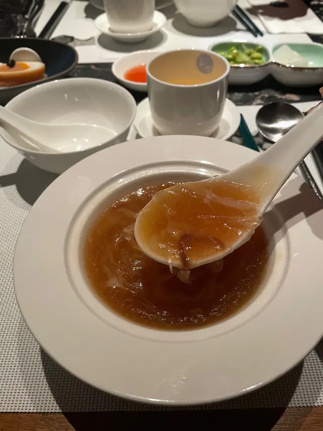 紅燒竹笙魚翅的湯羹濃郁美味、竹笙的脆口與魚翅的彈性令口感更豐富。