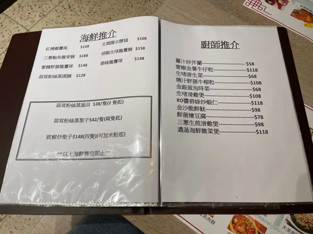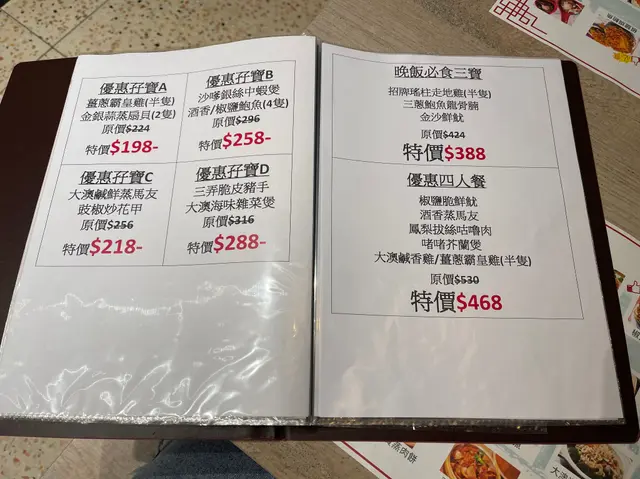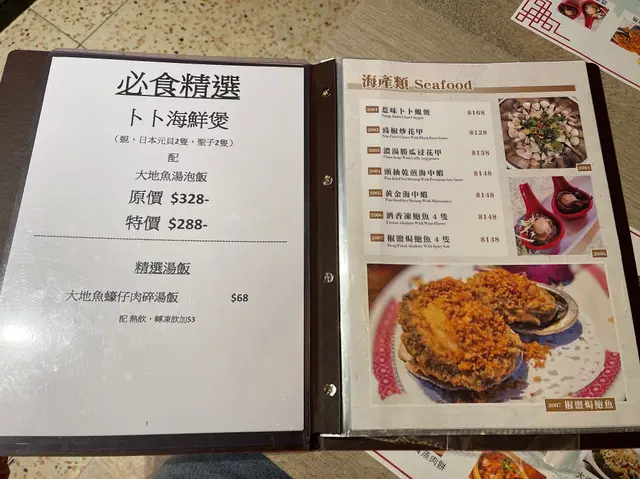 佢同其他茶記一樣有提供茶餐同晚飯小菜。不過小菜款式繁多,而且更有好多樣係同海鮮有關🦐。餐牌上嘅每一道菜式都好吸引,當中更有孖寶套餐,我哋嗌咗優惠孖寶D($288),有豬手同雜菜煲。