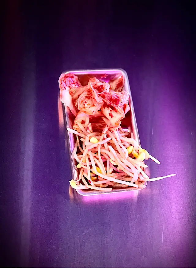 我哋去嘅時候正值Happy Hour,想嚐下美食同飲杯酒。平時去酒吧通常都係提供nuts ,但係呢道就提供咗一碟韓式泡菜同芽菜。