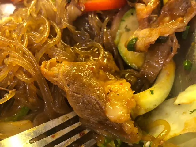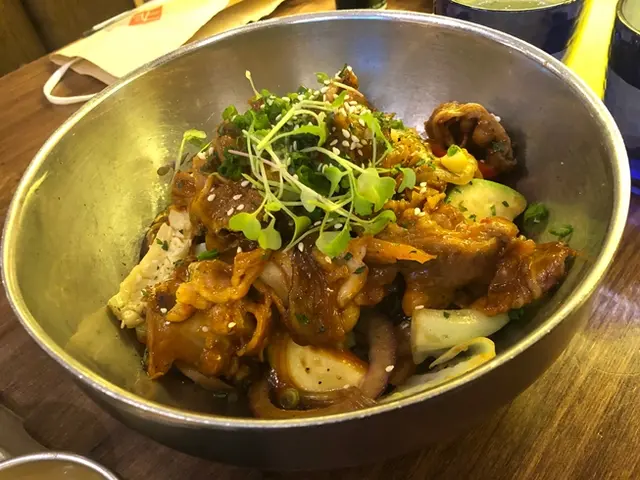 肥牛先用上韓式烤肉汁處理, 像甜豉油的味道十分討好。牛肉油份分佈均勻, 切得厚薄適中, 不會吃下去太一口油或太硬。