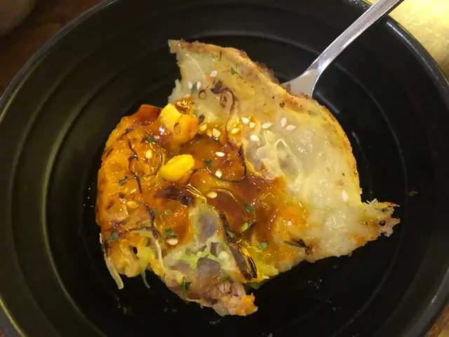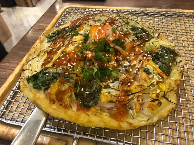 上層的配料也幾多, 切片滷豬手味道十足, 薄切的很易咬開。加上椰菜絲和粟米等, 增強了口感和鮮甜。蔥及芝麻則同時豐富了味覺, 令整個菜餅更香。而韓式辣醬就起了畫龍點睛的功效, 甜中帶微辣, 惹味又開胃, 是很好的夏日輕食選擇。