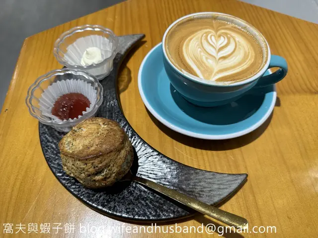 喝了一口咖啡後,伯爵茶鬆餅($40)也送來了,月牙形的碟子上放著鬆餅、clotted cream和果醬,旁邊加杯咖啡,構圖美得要替它們拍張合照。
