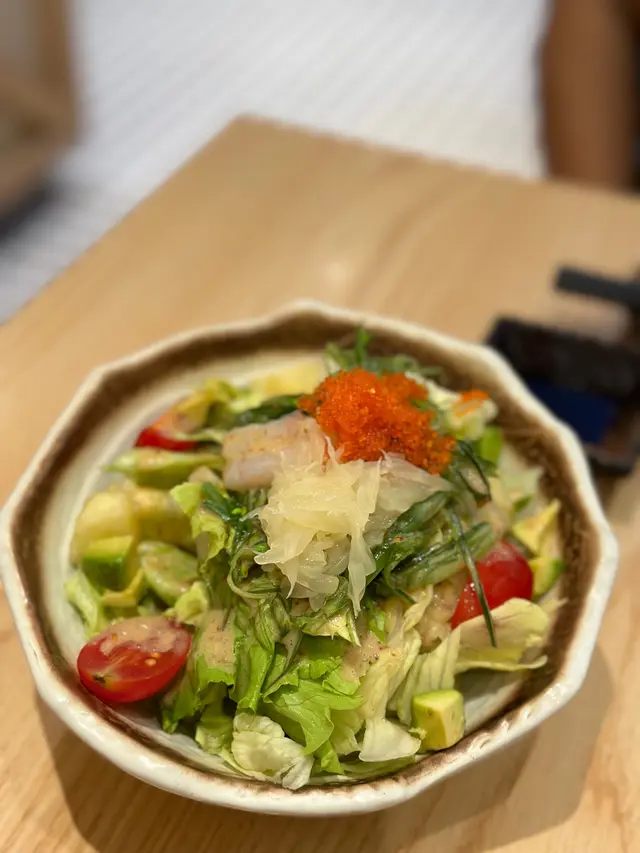 餐廳嘅裝潢都幾日式,舖入面仲有一個小型嘅鳥居搭建左喺呢度,一般我哋去食日本嘢都唔少得嗌個沙律㗎啦,今次我哋就嗌咗呢個柚想蝦你沙律,蔬菜嘅份量同新鮮程度都不俗,甜蝦非常新鮮,而且醬汁酸甜開胃,冇令我哋失望。
