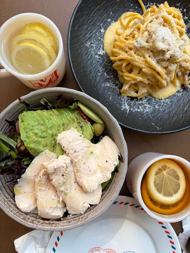 食物唔錯😌環境加分👍🏻 Gremlins1031等級42025-12-09 關注 Bookmarked 咗好耐,今日可以去試一試la 😊我哋叫咗兩個lunch set, 一個係牛油果🥑雞肉黑醋沙律🥗;另一個係芝士手工意粉!沙律🥗雞肉有咬口,配牛油果黑醋汁好夾,我哋好like 👍🏻另一個手工意粉,意粉好味,但芝士同煙肉太足料,有d 漏!今日餐湯蕃茄湯,好濃蕃茄味,略帶酸👍🏻開胃之選!😊餐飲配咗熱檸茶and 熱檸水,杯靚但份量較少,大杯d 就好la!環境好舒適,樓底高,陽光從玻璃滲進餐廳,配上柔和音樂,可以慢慢傾慢慢坐,性價比算高,這是一間我會再回頭嘅餐廳👍🏻人均消費約$120 以上食評乃用戶個人意見 , 並不代表OpenRice之觀點。讚好分享食物唔錯😌環境加分👍🏻 心心念念 https://s.openrice.com/QrbT0yS6lW0檢舉 張貼 評分4味道4環境3服務4衛生4抵食用餐日期2025-12-08用餐途徑堂食人均消費$120 (午餐)