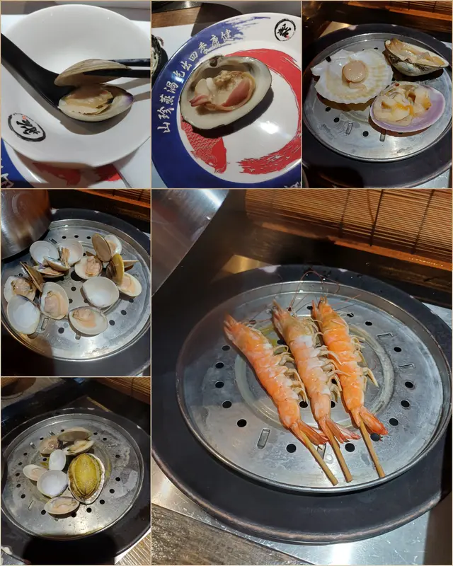 *海鮮: 白蜆、蝦、 鮮魚片、 大蜆、 北寄貝 ,鮑魚