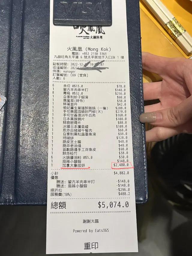 食過最普通又最細小最貴的象拔蚌食海鮮要小心 Princess Foodie CA等級22023-01-0289 瀏覽 關注 早幾日晚上六個人食飯 叫了個雞龍蝦火鍋 七點去到,8點45分才說無曬龍蝦,我地中間食住其他小食先 因都有兩個朋友遲收工遲左,我地唸住佢845來鍋底都無問題 點知咁耐先講無曬龍蝦 我地即改其他款, 原本想845分就可以開爐火鍋, 點知最後9點多才可以開始打邊爐 咁都算😵最重重重點🔥🔥🔥 一舊好細唔夠一斤既象拔蚌境然收$2480!!!(間野主動送了兩個小食來,我地覺得都態度良好無防備, 仲話加拿大象拔蚌好新嘅鮮話留一隻比我地 我地覺得好啊試下, 來到隻象拔蚌好細牒六個人跟本唔夠食, 但埋單時發現呢舊咁細既象拔蚌盛為$2480大元💥💥💥好離譜 問番間野 佢笑笑口話下似來每人送一隻鮑魚 我地唔會再咁傻來比人湯羅!)從未食過咁普通而又咁貴咁細隻的$2480味道淡,冇乜特別$288炸魚皮係新鮮好食係好食 有風味以上食評乃用戶個人意見 , 並不代表OpenRice之觀點。讚好分享火鳳凰火鍋料理 https://s.openrice.com/QrbT0qZf700檢舉 張貼 評分3味道2環境3服務3衛生1抵食推介美食燒羊串用餐日期2022-12-30用餐途徑堂食人均消費$830慶祝紀念生日