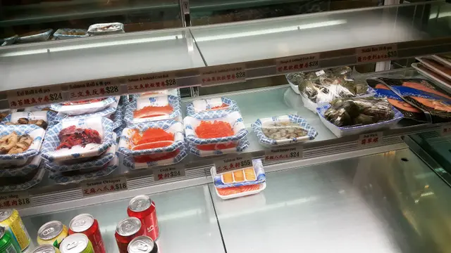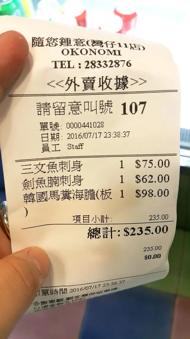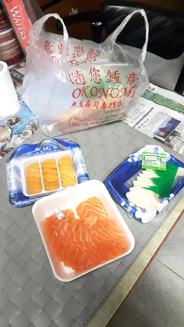 收工後突然好想食宵夜,不過又趕住搭港鐵,是日接近深夜時份,決定買些東西回家享用,放工經過一間賣魚生、手卷的門店「隨您鍾意 Okonomi Japanese Food」,雖是現在已經11:30pm,但是門外等外賣的客人都不少,在門外及店內的廚櫃看了一陣,那麼就選擇了一些刺身及一份海膽外賣,取票後,等師傅幫我把劍魚腩切片,所以都等了一會兒才離去。