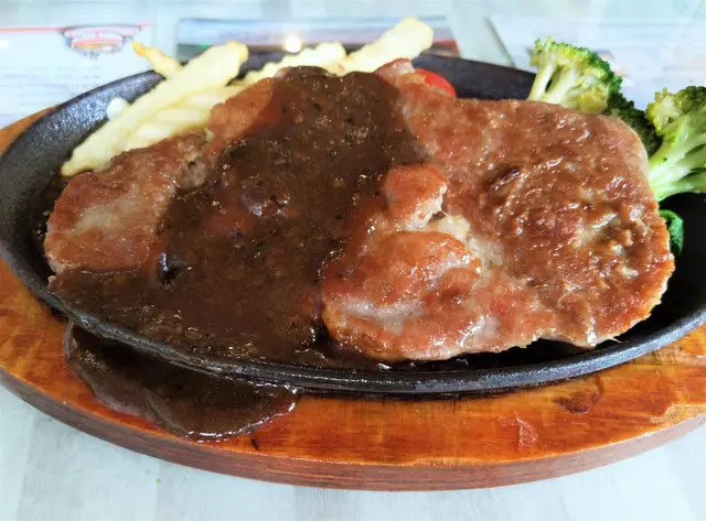 Step被它的size所嚇到,豬梅頭肉扒足足有成塊鐵板般大,厚度也有半吋厚,單看豬梅頭肉扒表面已經感覺到肉質鬆軟濕潤,看到Step不繼狂嚥口水呢?!