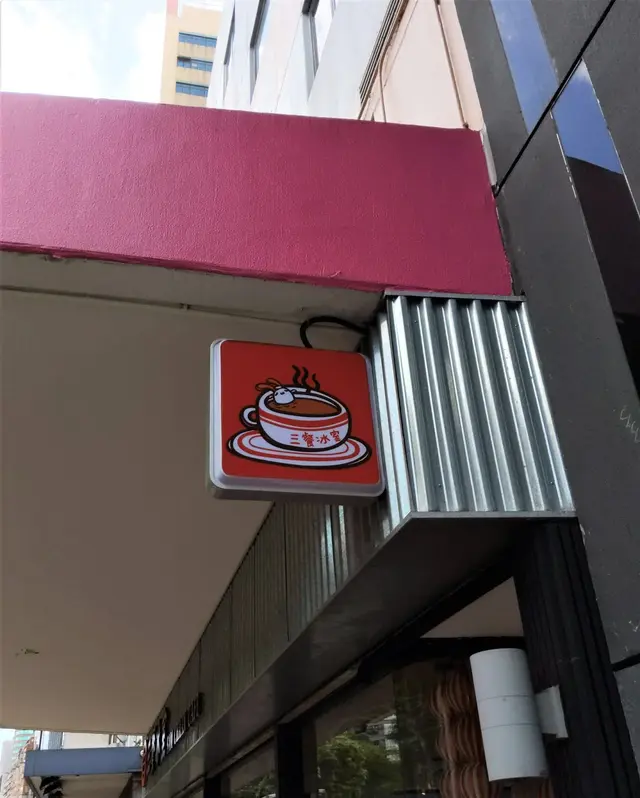 未入三餐冰室之前,你可以看到全落地玻璃貼上了以彩虹邨作為背景的半透明貼紙、店舖招牌用了簷篷波浪紋的鋅鐵、門口的一邊放了一串串紅白色的『西瓜波』,充滿著香港地道的特色;