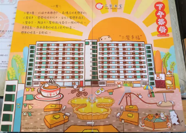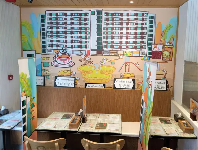 水吧隔離的牆上以香港6-70年代的公共屋邨做題材,裡面還融合了冰室中不同的美食做背景,如蛋撻做花園噴水池、西多士做公園長櫈、又有香滑奶茶、紅豆冰、凍檸茶等Q版公仔,這張圖不禁令Step望了一陣子;