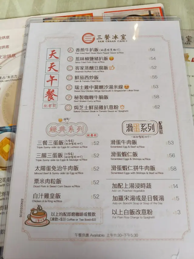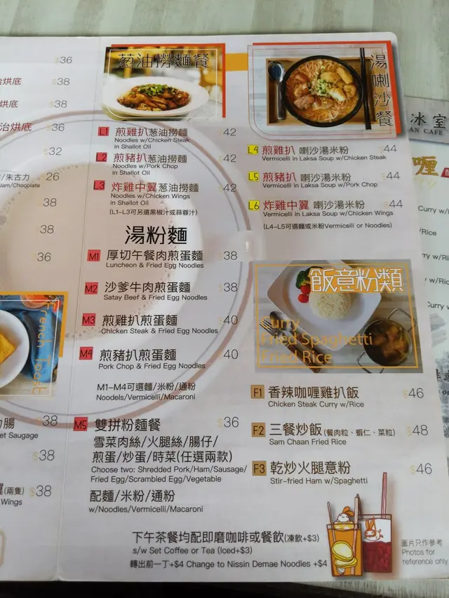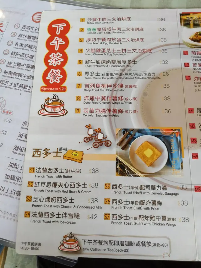 坐下後Step立即看看餐牌,現在時間是17:15,下午茶餐牌來說也挺多選擇:如下午茶套餐、西多士系列、湯喇沙系列,蔥油撈麵餐等,實在非常豐富,已經令Step和娘子陷入選擇困難症呢…
