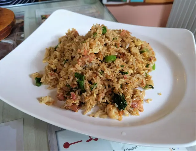 炒飯送來後,鑊氣十足,熱哄哄飯香香噴噴;炒飯是用雞蛋一起炒,可以看到一粒粒大大粒的午餐肉(梅林牌)、蝦仁、還有大大粒切碎的菜芯,用料尚算豐盛多樣化;