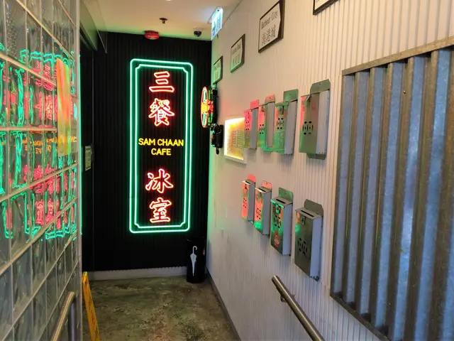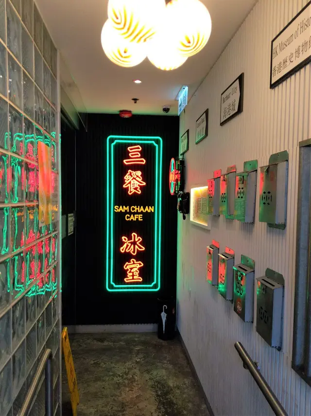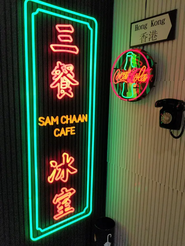 『三餐冰室』招牌用上霓虹光管來製作,旁邊同樣有一個『Cola Cola玻璃瓶霓虹光管,暗示這樣提供的可口可樂是玻璃瓶;
