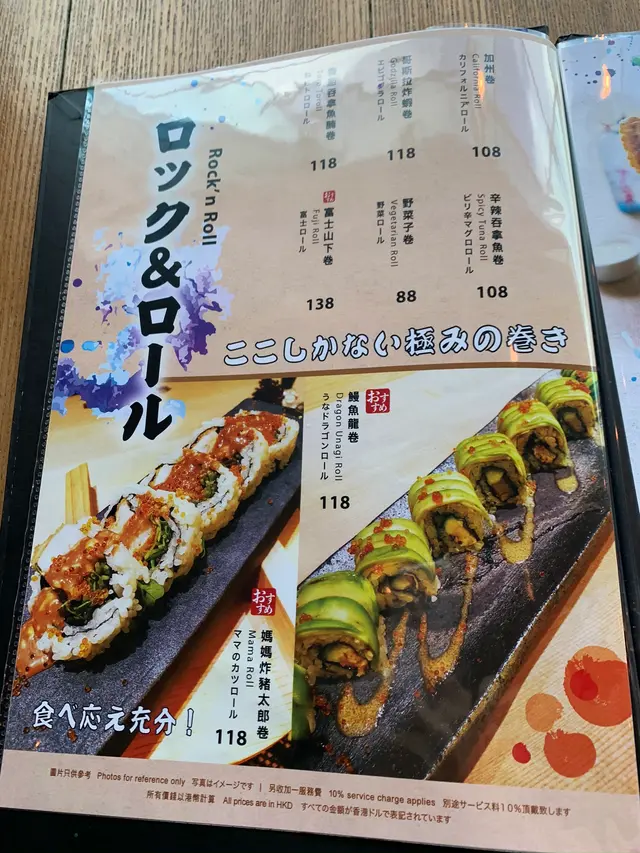 食物方面,這裡的rocknROLL卷物有很多配搭,有香蔥吞拿魚腩卷、哥斯拉炸蝦卷、鰻魚龍卷、媽媽炸豬太郎卷、富士山下卷等等,全部都好吸引呀。