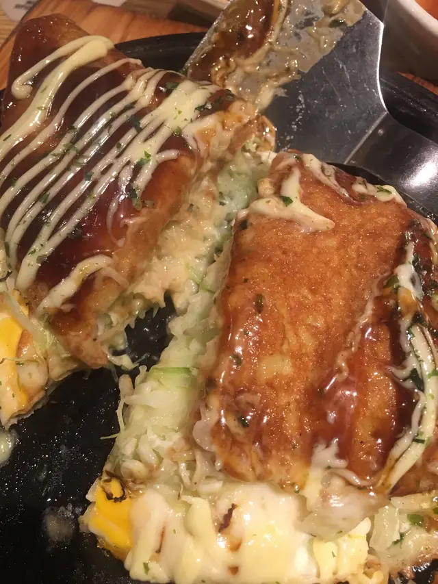 再來e個好吸引, 大阪椰菜燒, 鐵板上熱辣辣!👍🏻入面好多椰菜絲, 之後食淡淡ge芝士, 加埋醬汁, 囗感豐富!👍🏻👍🏻😍😋 其實食到e碟, 已經好飽!😂