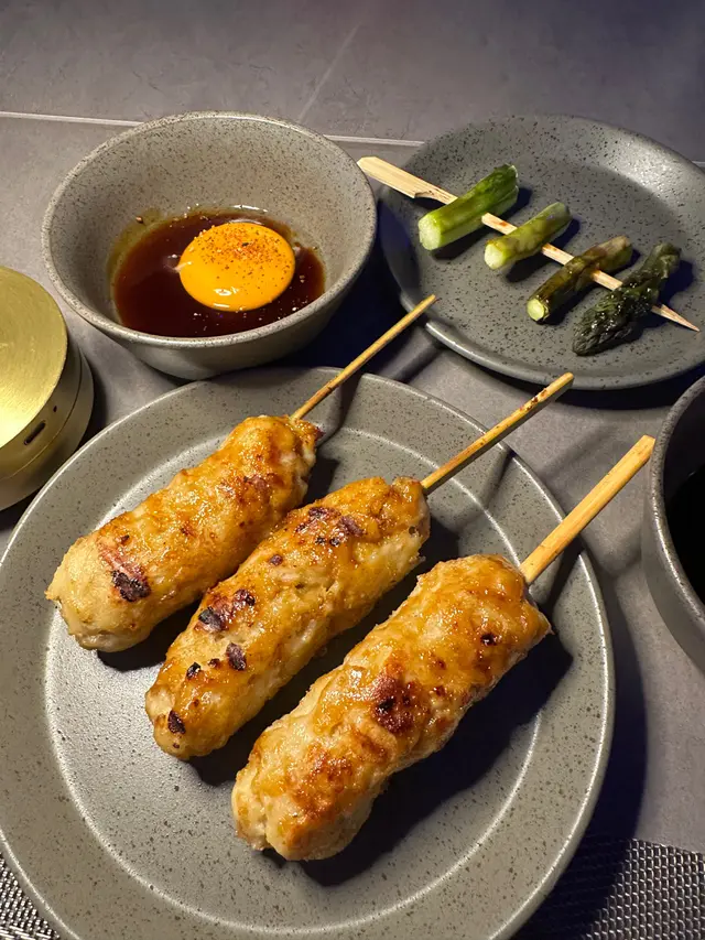 🍗月見免治雞肉棒:一嚟到份量嚇親,有三大條😮呢個做得非常好👍🏻裏面嘅雞肉同軟骨比例剛剛好,裏面仲有啲Juicy嘅感覺,一定要點埋個蛋黃一齊食,初頭睇以為份量好多,點知好快又俾我哋食哂!😝
