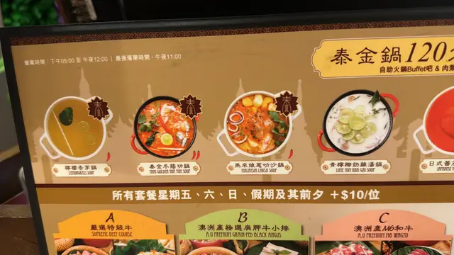 打邊爐或者食放題都開始食到有啲厭,想試吓啲新嘅嘢,留意到依間泰金鍋,泰式火鍋加放題形式都幾特別,肥編就同朋友過嚟試吓。我哋揀咗B餐,$268一位,包澳洲產極選肩胛牛小排同80種食物放題。首先揀湯底,有8款湯底選擇,我哋揀咗青檸椰奶雞湯鍋同泰金冬陰功鍋。2個湯底都好正好鐘意,冬陰功鍋唔係好辣,偏酸,我依啲食唔到辣嘅都食到,大家可以放心。