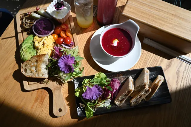 全日早餐的擺盤很用心,色彩豐富,有沙律菜、鴻喜菇、酸種麵包、炒蛋(使用日本蛋)、牛油果、紫薯蓉、車厘茄、乳酪和蓮霧,味道不錯,食材新鮮,搭配起來口感豐富。