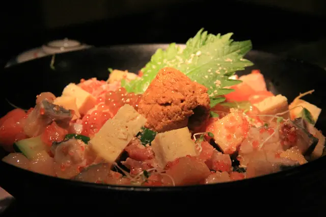 魚生飯刺身份量超多,中央有一大份肥美海膽,色澤金黃,十分新鮮。魚生粒中希靈魚份量較多,玉子較少,與尖沙咀出品的那充滿三文魚、立魚和吞拿魚的雜錦魚生飯略有差異,但此店提供的海膽份量則慷慨,依然是我的最愛。