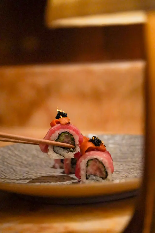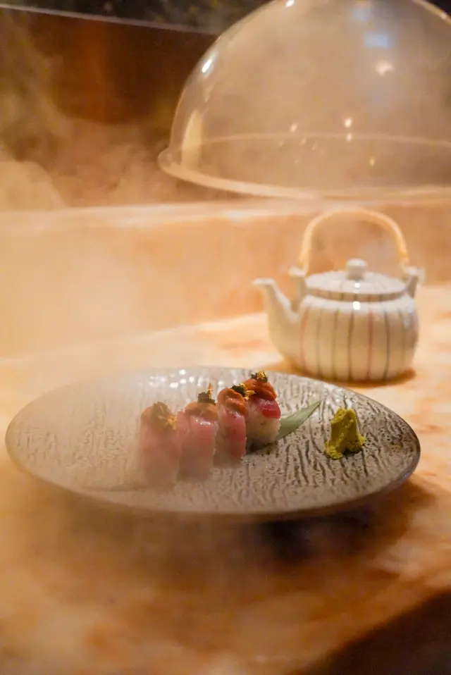 最夢幻的一道壽司!即場開蓋時會有煙燻效果,拖羅卷上有奢華的點綴:黑松露、海膽、金箔