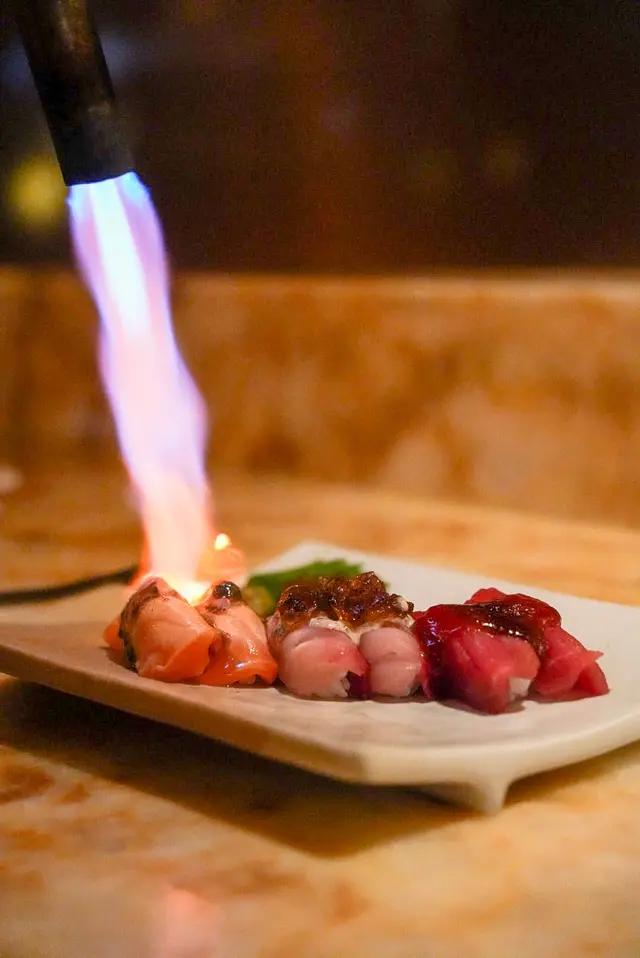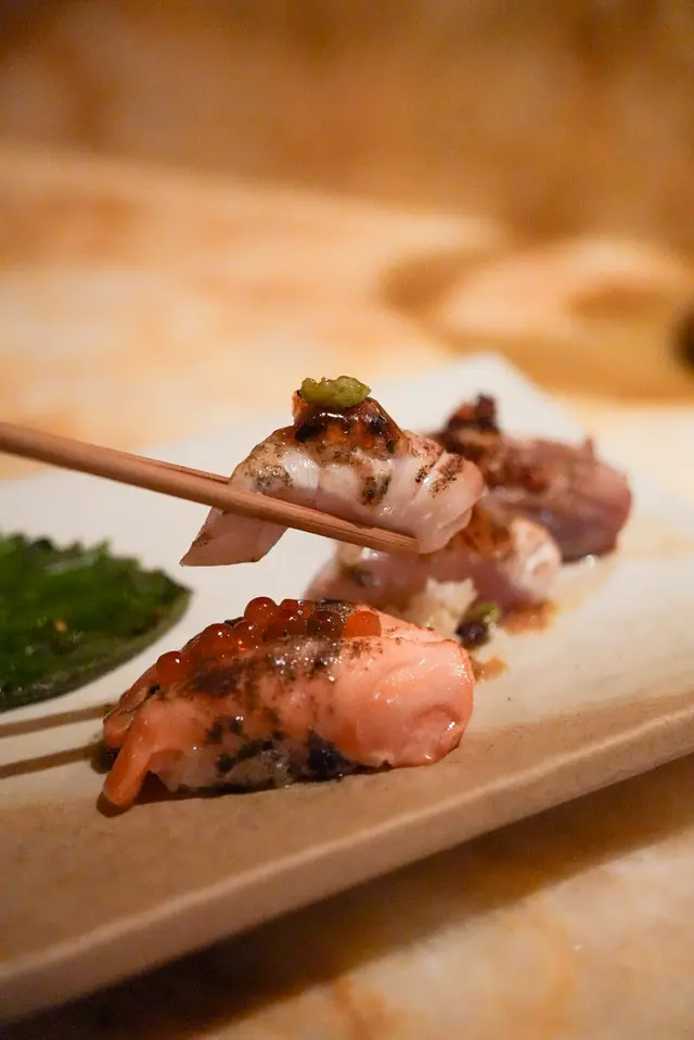 而火炙壽司更是即席火烤,用火槍的熱度烤至半熟,把刺身的油脂都燒出來,入口即化~OMG