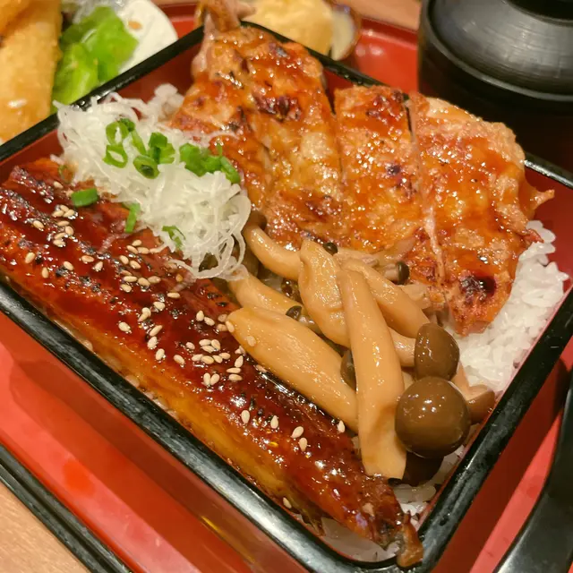 嘩,一打開蓋,鰻魚嘅香氣即刻撲鼻而嚟🤤!鰻魚燒得油油亮亮,醬汁甜甜鹹鹹,撈埋啲飯一齊食,簡直係perfect match!鰻魚肉質肥美,入口即化,但係如果可以再厚身啲就好啦!雞肉嘅份量都幾多,照燒醬汁味道唔錯,甜甜地,好開胃。雞皮燒得有啲脆~飯嘅軟硬度啱啱好,粒粒分明,索晒啲醬汁,正呀喂😋!