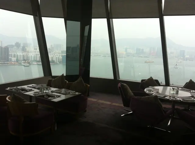 Le 188位於酒店的41樓頂層,甫入餐廳,眼前是270度全維港闊銀幕,藍天白雲,觸手可及;官塘、尖東、北角到西環俯首足下。難得的是通道寬敞,餐桌疏落有致,且全都是靠窗邊位置,與海為伴,友人先給予50分選址獎勵。餐桌是白色雲石矮腳圓枱,配紫色絲絨大椅。