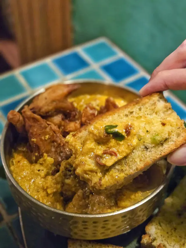 上檯已經引起朋友的嘩嘩聲,因為炸軟殼蟹十分大隻,而且有滿滿一梳梳的蟹肉鋪在濃郁咖哩之上🫕軟殼蟹極度酥脆可口,咖哩的椰香味很飽滿,必須點上跟配的意大利香草蒜蓉包🍞和一般坊間偏鹹的蒜蓉牛油包完全不同,香草味較為突出,與咖哩擦出美妙火花