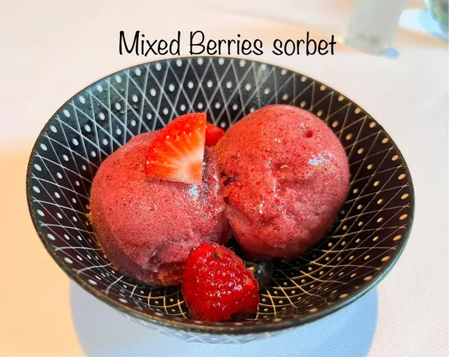 Dessert- Mixed berries sorbet- the sorbet was on the sweet side and it needed more acidity and flavour from the berries to balance out the sweetness.