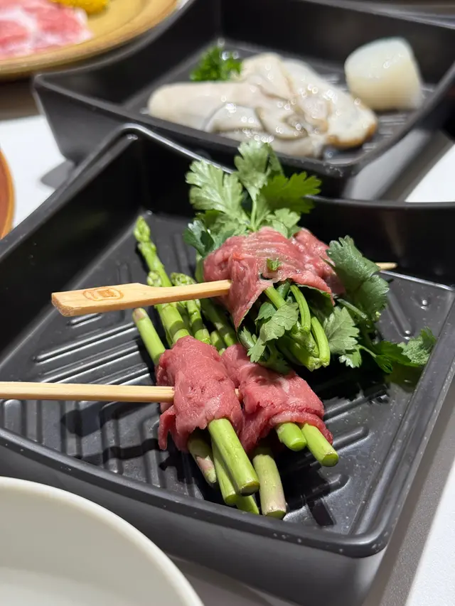 和牛卷住爽脆露筍或芫茜,一啖咬落去