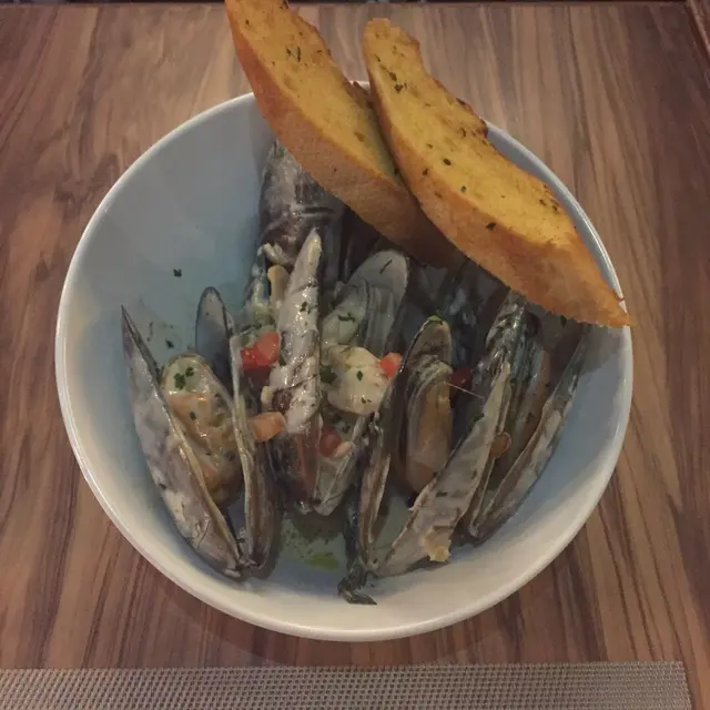 With garlic bread. The mussels were nice and fresh with chunks of tomato and that