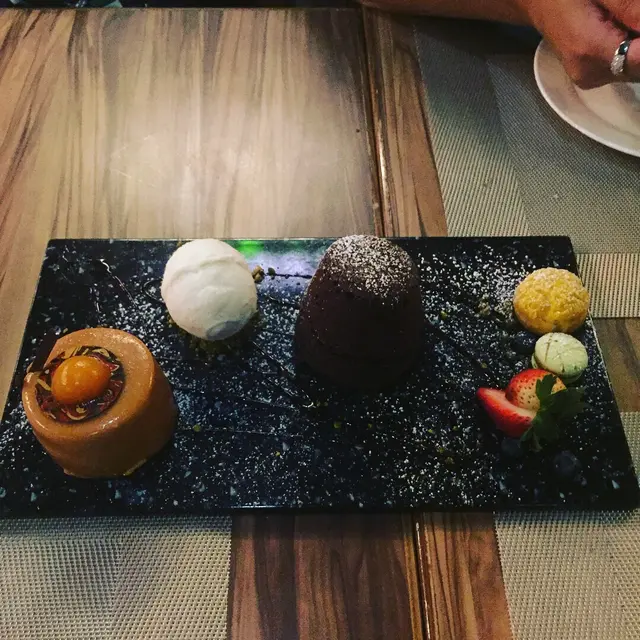 Having been tempted into the dessert with the oh there's three of us we could share one so went with dessert combo of caramel cake , chocolate fondant cake accompanied with vanilla ice cream, a green tea macaroon and a cream puff with passion fruit filling.