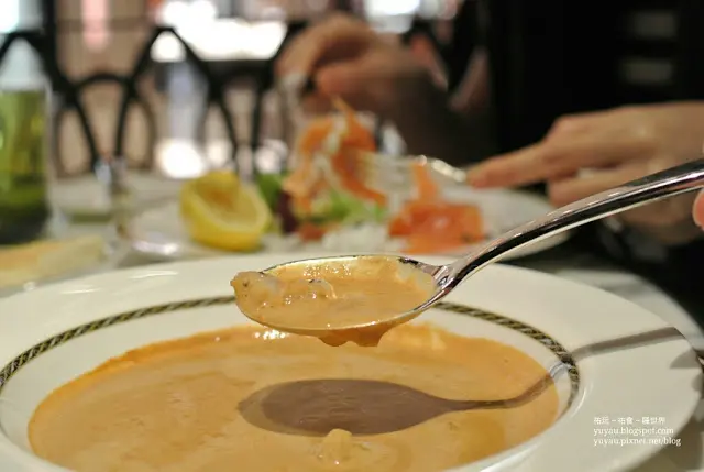 有訂枱, 不過其實walk in 都可以因平日唔多人有dinner set,所以唔諗...就order 2份是日有推介organic Merlot 紅酒同fresh milk老公就叫左紅酒, organic 就唔識欣賞, 但老公話透下氣之後都幾好飲喎座位側邊有音樂聽, 佢只會自己彈奏, 唔會逐枱叫你點唱有人生日就夾埋職員送上蛋糕, 兼且彈奏生日歌餐廳整體感覺都舒服set dinner 來之前, 先食住面包, 面包無咩特別, 有少少硬身....跟住因為無煙三文魚呢個前菜, 所以我同老公都點左龍蝦湯個湯唔會話有層燶味, 濃度啱啱好, 幾塊龍蝦肉, 超級鮮甜超好味呀!!