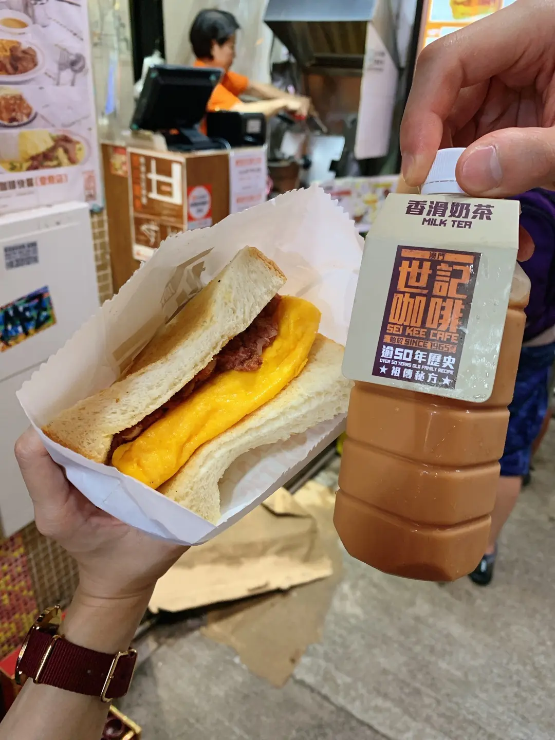 咸牛肉厚蛋多士、奶茶