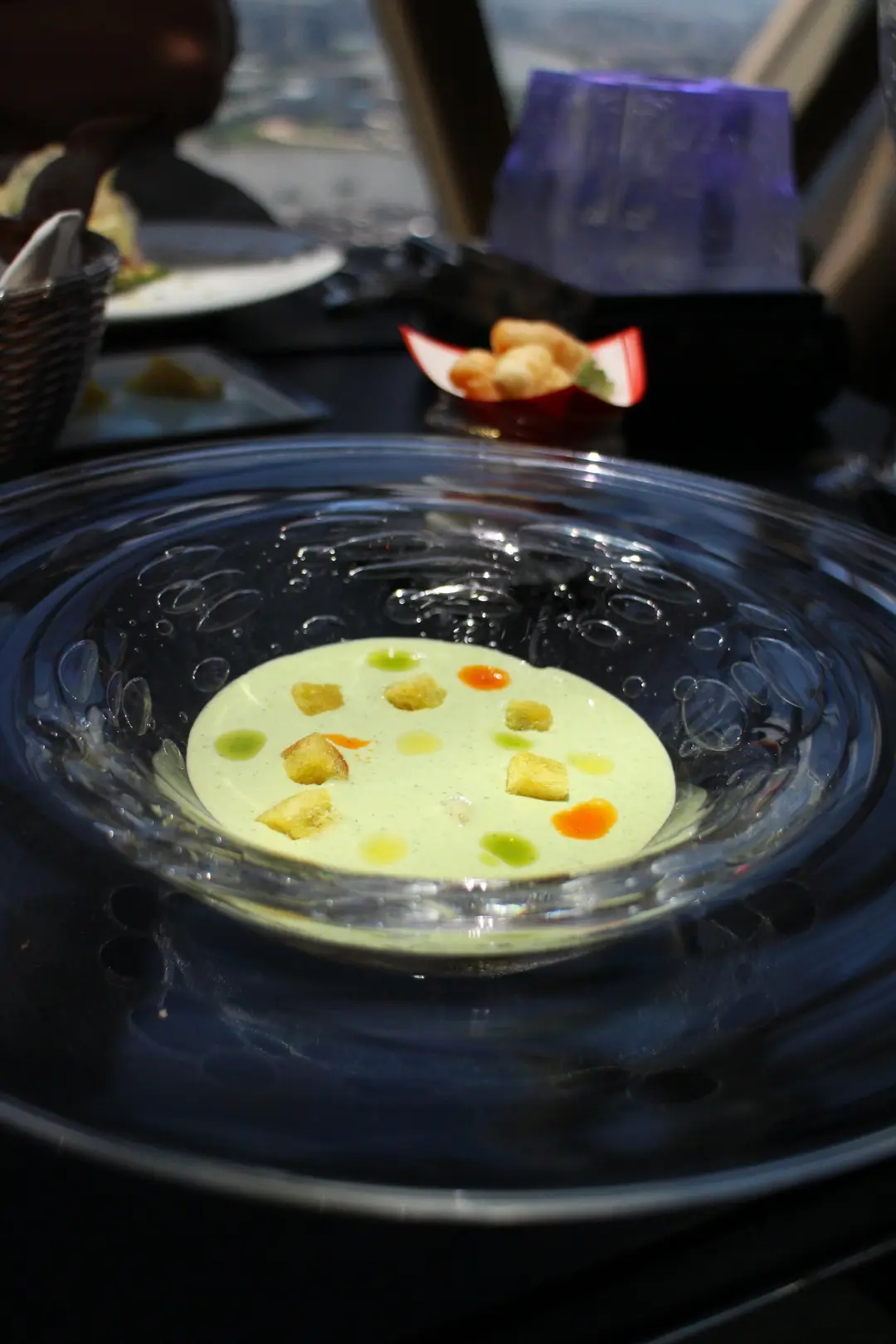 鮮蟹肉伴牛油果,蕃茄啫喱及荽茜凍湯配天婦羅