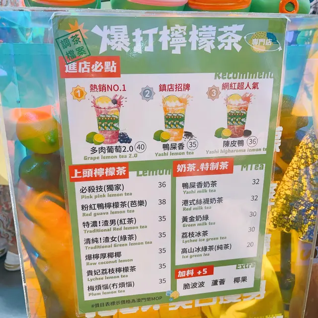 最近天氣超級無敵熱,一出街就熱到溶啦🥵!今日去左澳門玩,係氹仔見到個個都拎住呢杯爆打檸檬茶,所以就同朋友一齊試下消下暑💚*****🍇多肉葡萄2.0 Grape Lemon Tea MOP $40🫨梅煩惱(冇煩惱) Plum Lemon Tea MOP $35🩷粉紅鴨檸檬茶 Red Guava Lemon Tea MOP $38😎必殺技 Pink Pink Lemon Tea MOP $36🦆陳皮鴨檸檬茶Yashi Higharoma Lemon Tea MOP $36*****幾個朋友叫唔同嘅share飲好開心🥰啲檸檬茶全部都真係爆打🤣等嘅時候聽到入面瘋狂暴打檸檬嘅聲😆檸檬汁爆多同好真材實料!夏天飲真係超正🥰必殺技同粉紅茉莉都有西柚肉係入面🍊,多肉葡萄就有提子肉🍇,陳皮鴨好特別,加左陳皮碎,鴨屎香茶底都好香💚查看更多