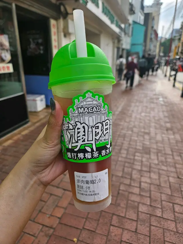 😋近來好hit手打檸檬茶,去到澳門都要飲番杯。今次試咗店舖Number one多肉葡萄檸檬茶,好多果肉,幾好味。仲加抔鴨屎香檸檬茶就嘆嘆😚氹仔官也街咁多小食,又有牛雜杏仁餅葡撻甜品,又有咁多間手信店可以試食,真係會食完好鬼頸渴,整返杯檸檬茶,又真係幾爽。😋檸檬茶通街都有,但係講到好味嘅,真係首推呢杯多肉葡萄手打檸檬茶,好特別,其他舖頭沒有嘅,食落去啖啖果肉,甜度適中,真係諗起都好回味。感覺好清新好特別。查看更多