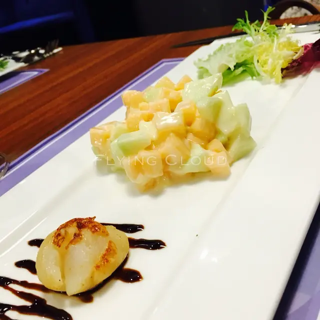 首先去到等左好耐無啦啦黎左三碗湯,我地一頭霧水問唔係有頭盤嗎😅?職員話整錯左個湯先,所以又收返果三碗湯。之後等左陣就出個頭盤。頭盤係一粒半生熟帆立貝,卡夫沙拉醬撈水果(本人超級唔鍾意卡夫沙拉醬😖),同埋幾片無汁既菜🌿。我就唔係咁鍾意,菜好乾,我想點帆立貝個汁又太少點唔到,最後乾食左幾片菜。帆立貝可能因為係頭盤,所以是凍的。個水果沙拉我可能自己有偏見,我真係覺得好難食呀D卡夫沙拉醬😩。