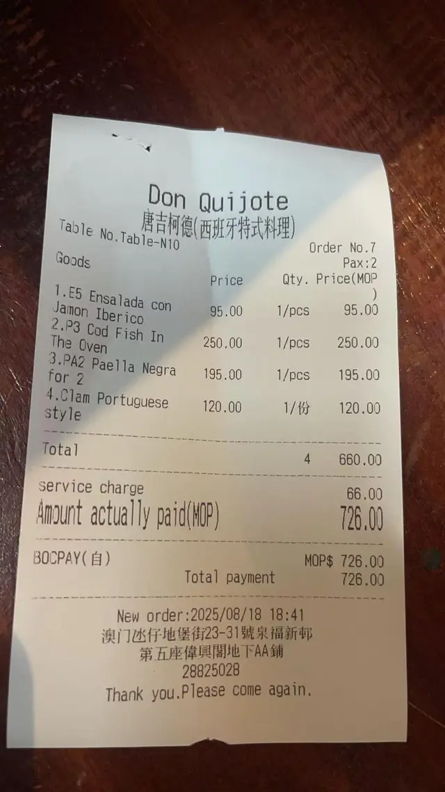 出色燒馬介休 antonia197619等級42025-09-24153 瀏覽 關注 喺澳門想同時試到正宗西班牙菜同地道葡萄牙菜,唐吉柯德絕對係獨一無二嘅好去處。今次專登同朋友嚟試吓佢哋嘅幾款招牌菜,果然冇令我哋失望葡式炒蜆一上枱已經聞到濃濃蒜香同白酒味。蜆肉肥美又鮮甜,完全冇沙,個汁調得剛剛好,唔會太鹹,用嚟點麵包真係無得彈。跟住試咗燒馬介休,魚肉烤得外脆內嫩,鹹香恰到好處,唔會蓋過魚本身嘅鮮味,炸過嘅薯仔點汁都好食西班牙海鮮墨汁天使麵既墨汁味道濃郁得嚟唔會腥,麵條彈牙有嚼勁。海鮮料好足,有爽口大蝦同魷魚,每一啖都食到鮮味如果大家嚟澳門想一次過試勻兩種歐洲風味,呢度真係值得推薦!以上食評乃用戶個人意見 , 並不代表OpenRice之觀點。讚好分享出色燒馬介休 唐吉柯德 https://s.openrice.com/QrbT1zaOl00檢舉 張貼 評分5味道5環境5服務5衛生5抵食用餐途徑堂食