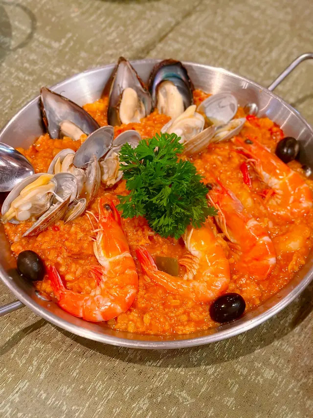 海鮮飯用料超足!有齊大蝦、青口、蜆仔鋪滿成個鍋,飯底偏濕潤,鮮甜得嚟帶少少辣