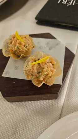 每人限送一份的餐前小食三文魚薄脆迷你撻,一口便可享用。軟滑三文魚蓉配上又薄又脆的撻,大家都讚好味兼不夠喉!