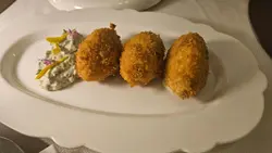 馬介休球格利比什醬 (MOP40/件),馬介休球炸得金黃酥脆而不油膩,內裡的魚肉飽滿又絲絲細嫩,蘸醬料來吃就更為滋味。