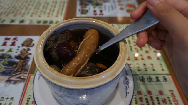 燉品實際上不只有湯,還有燉雪梨等甜蜜滋味,可是早餐還是鹹食比較合口味。一看餐牌,最有興趣的當然是羊肉,可店方指季節未到沒有供應,此時吃羊肉就怕太燥。然後打算轉投花膠的懷抱,可惜時間過早,未能及時準備好食材,回答是無貨。建議還是下午或晚上才去,那時的出品應該新鮮一點,而且更齊全。