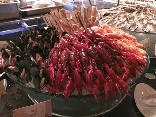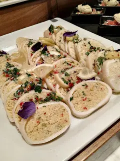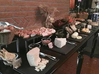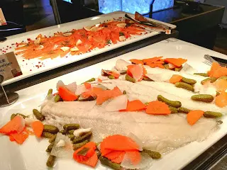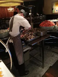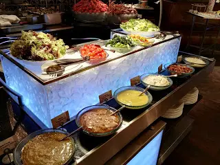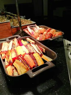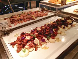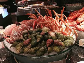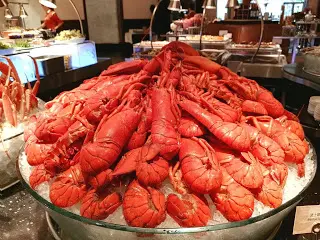 吃 Sunday Brunch 似乎與海鮮已拉上緊密關係。早上拉開序幕的是一系列凍海鮮,波士頓龍蝦、法國麵包蟹、翡翠螺、阿拉斯加蟹腳、青口、聖子等都大量供應,而且質素與晚餐的不相伯仲,食客也相當私文,不會爭食。