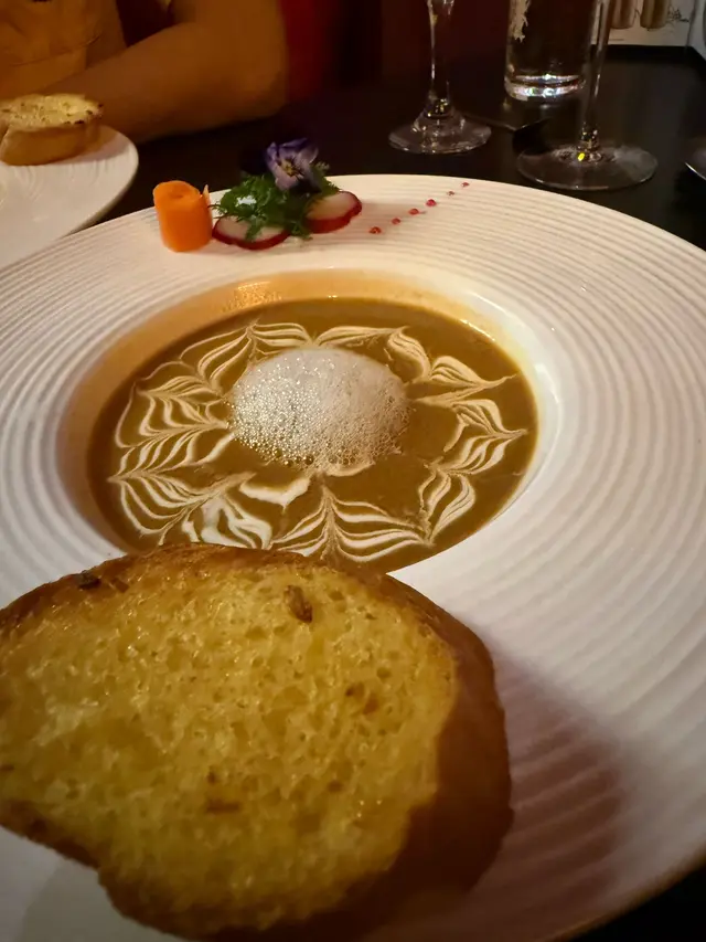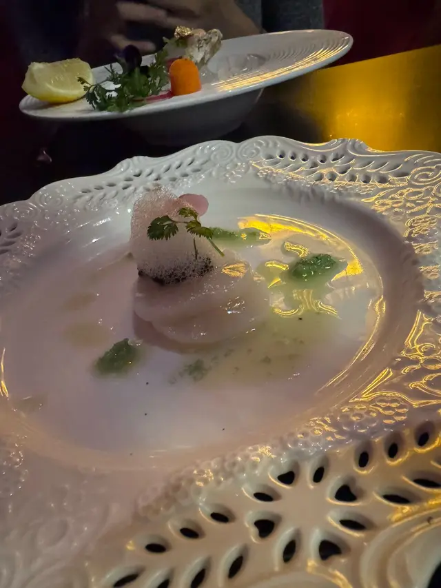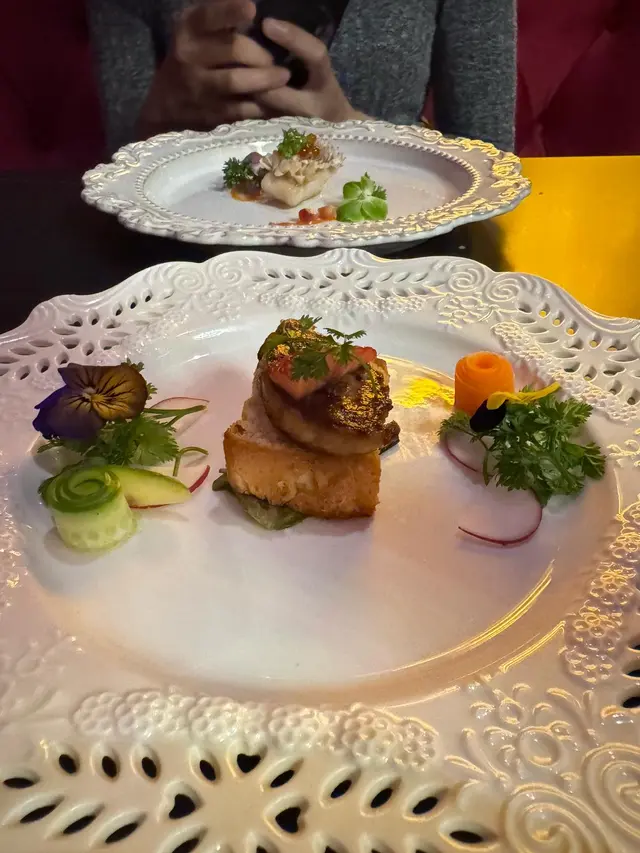 出發前睇其他食客差評都有D擔心會唔會中伏,但見到每個差評下餐廳都有認真回覆,而且睇食客們D打卡相由2023年到2025都有幾大變化,加上於訂座當日餐廳有whatsapp溫馨提示教我地點樣去,頓時覺得間餐廳係用心經營所以都抱有期待。去到門口就幫我地開門之後就安排入座,枱面有本好大本menu,我地先睇單點有咩食最後先睇Set如果menu字體大小小會好D,同埋個價錢有小小難睇我都睇左陣先睇到佢地有兩個Set,我地各叫左一個,分別係八道同十道 因男友要揸車唔飲得酒所以叫左杯Mocktails - Sexy On Tree,可惜未影完相就爆左。第一啖覺得有小小似梅子酒味,但飲飲下覺得有D似飲緊維生素。我就叫左杯紅酒,原來係L'AMOUR自家紅酒黎,飲落覺得好純好清,我唔識點形容,同出面餐廳飲開的好大分別。全程都一直聞到酒香,男友一直拎黎聞(自問唔識品酒而且平時都比較少飲酒)帶子刺身頭三塊我覺得味道一般略帶一點腥,但去到最後一兩塊個味幾清新加返分生蠔配三文魚子都唔錯,可以唔洗加檸檬汁,個泡沫帶有小小鹹味法國傳統有機慢煮雞胸沙律, 雞胸真係值得一讚,一D都唔鞋,暖笠笠雞胸配上沙律菜幾好食法國傳統有機雜菜沙律, 好多椒籽配沙律菜,同雞胸沙律相比有點遜色法國特級鵝肝蛋撻, 先食啖蛋, 一入口就食到鵝肝味之後蛋味再慢慢滲出黎,最後又有返鵝肝味撻皮係牛油皮都做得好出色, 但兩樣一齊食撻皮牛油味會蓋過左鵝肝味法式活澳洲龍蝦濃湯, 龍蝦肉幾彈牙, 湯味道都飲得出有蝦膏味法國特級鵝肝多士